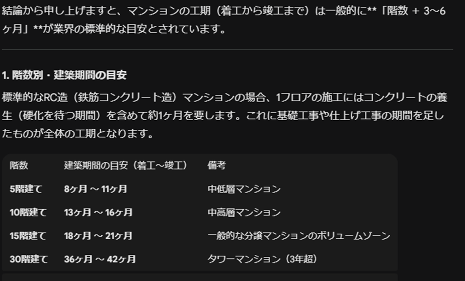 マンションの建築期間について 不動産特定共同事業 X Facebook はてブ LINE コピー 2026.01.06 ほぼ同じようなマンションを建てるのに、一方は6カ月、もう一方は20カ月の運用期間を設けている事業者がいました。 建築期間について、Geminiに聞いてみたところ、ほぼ同じ認識でしたのでご紹介します。 投資は自己責任です。