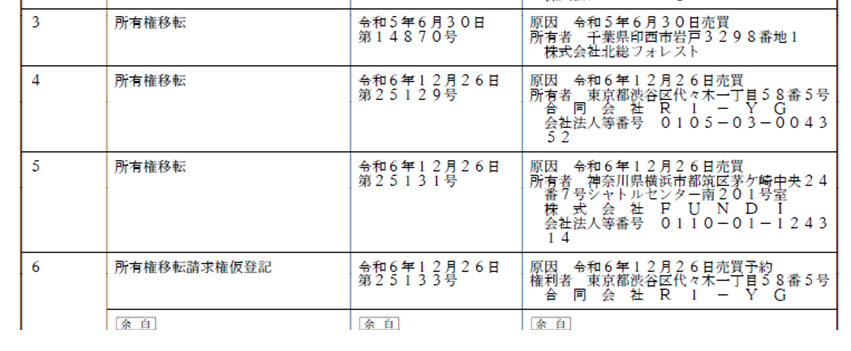 ①2024年12月26日に一部の土地(全部かもしれません)で以下の取引(登記確認)がされました。
