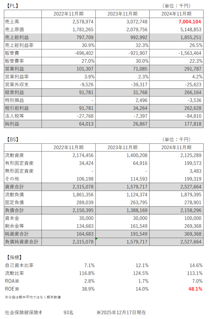 同社の親会社に「株式会社WALLMATEホールディングス」があり、そのサイトには2025年11月期のグループ売上高が125億円との記述があります。2025年11月期決算はさらにレバレッジが効いたBSになっている可能性が高そうです。推移を見守ります。